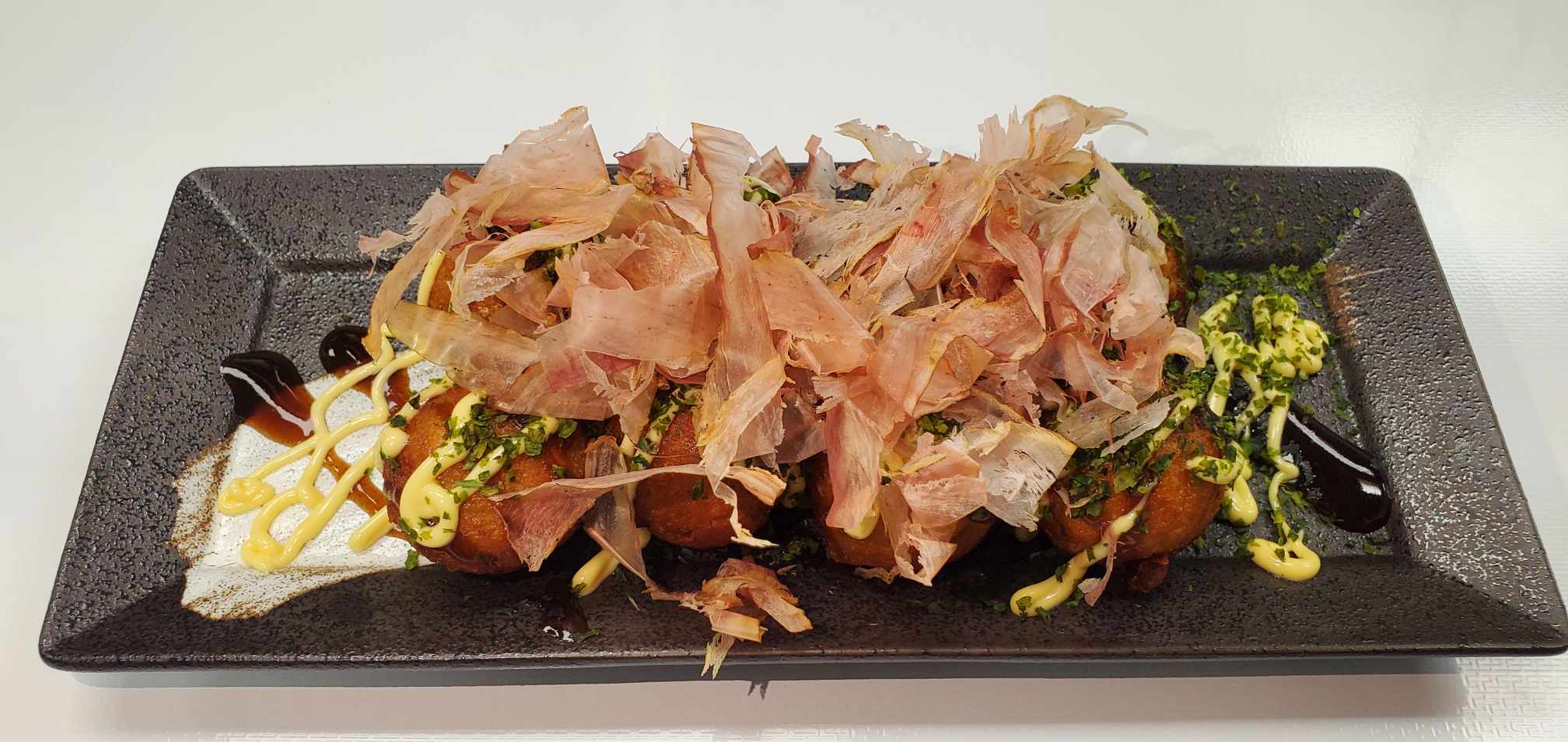 -Fried Wheat Balls With Octopus, Jap mayo, Takoyaki Sauce, Aonori and Bonito Flakes
